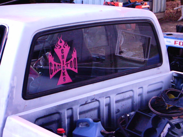 Light Gray Primer, with spray painted Pink flames on the driver side. Shaved Tailgate. Toyota 4-Runner Bumper. Full Billet Grill.
