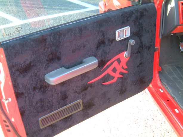 RED: NEW ROOF, DOOR PANELS, REAR BACK SEAT REST, CUSTOM SHIFTER, PEDALS, PAINTED ACCENTS, CHROME ACCENTS ON HEATERS, STEERING WHEEL COVER, INTERIOR NEONS, STROBE LIGHT AND A POLICE FLASHER UNDER THE BED OF THE TRUCK FOR NIGHT TIME SHOW.