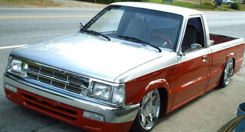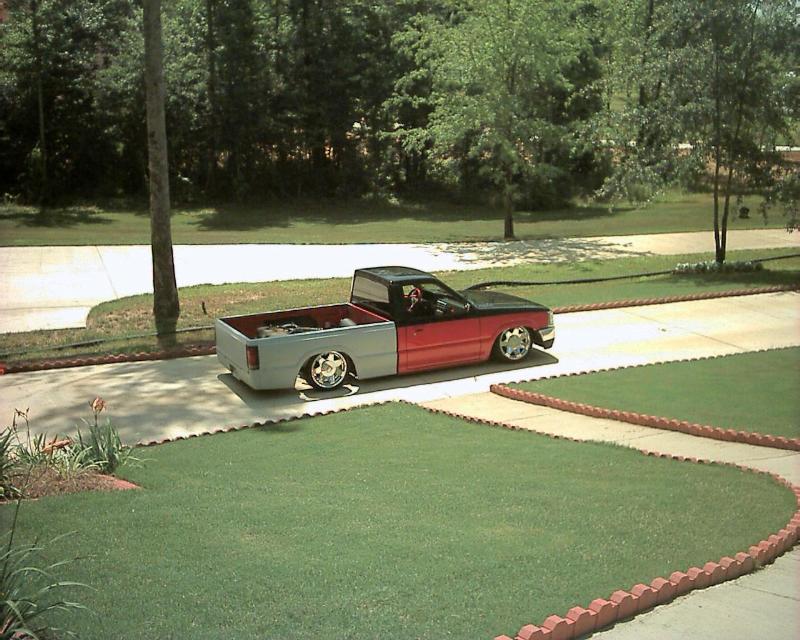 HOK Orion Silver and factory Mazda Sunrise Red. Shaved antenna, gas door, emblems, tailgate handle, molded in steel rollpan, chrome grill, chrome 4runner bumper with painted valance, clear corners, all red tails, diamond headlights, chopper mirrors, flush mount fiberglass bedcover made from a non-flush mount cover cut to fit.