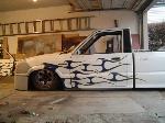 shaved tailgate handle, tail lights, welded tailgate shut, custom tail lights, molded roll pan, full sheet metel bed, frenched plate on angle. 3 inch body drop, full custom front end. 04 Jeep grand cherokee headlights, 04 caddy cts grill, custom fabbed bumper and rad support. full sheet metal firewall and wheel tubs. all work done in my driveway, with my grandpas stick welder and an angle grinder.