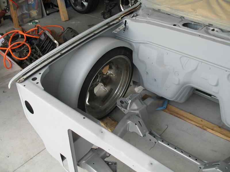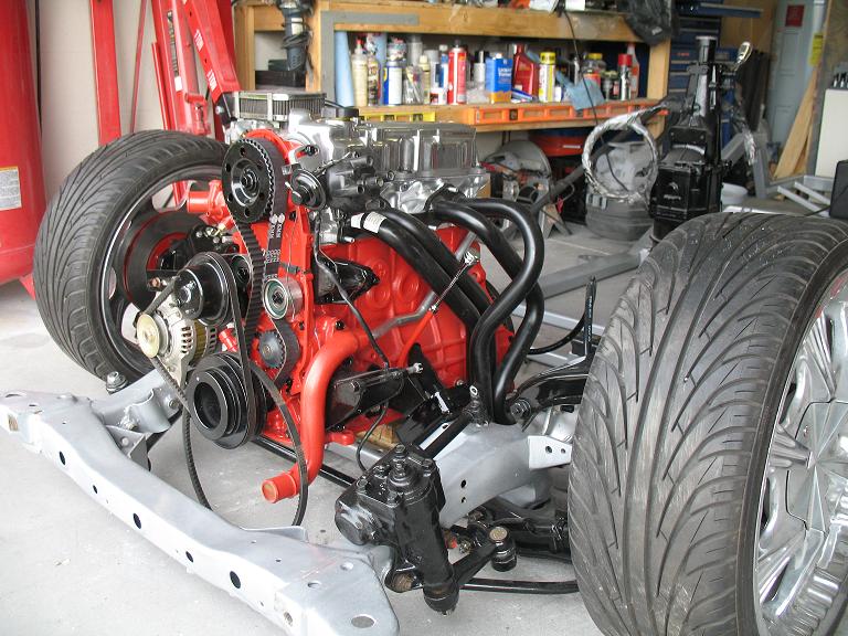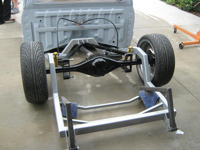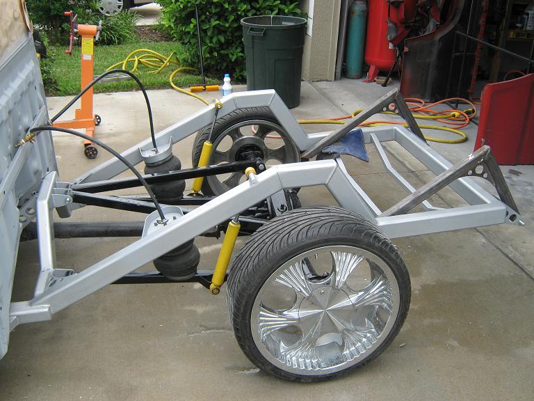 engineered stock floor body drop, dropped engine trans and carrier bearing 1/2" custom tabs, brackets, body mounts, 4 link, and all the other stuff nothing bought here! factory front clip welded up and ground smooth to flow with the rest of the frame, 2 3 gallon tanks and 12 gallon fuel cell mounted in rear, 2600 firestones on the bars in the rear 2500's up front, shocks all the way around, bed tilt, yada yada yada