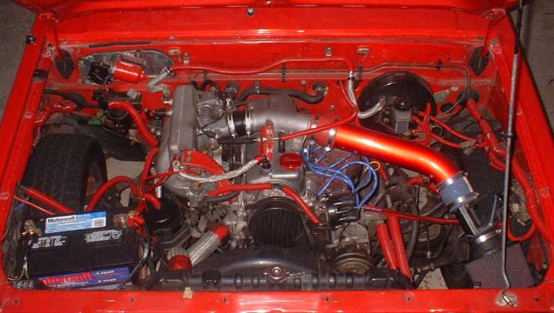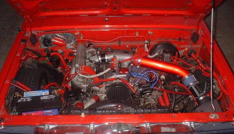 2.2l fuel injection, anodized red custom intake. fender wells cut out, red and chrome all over, oh and its an automatic, (good for hittin switches)