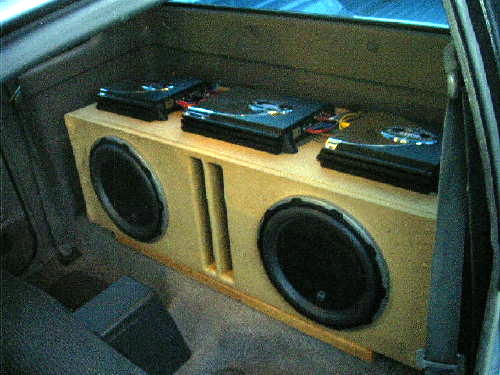 Clarion DRX725 pro audio head unit, 4 inch boston acoustics in front, JBL tweeters on a-pillars, infinity 6 1/2s in rear, 2 JL audio 12W6V2 subs in ported box, 2 MTX 6500D amps for the subs, MTX 6304 for the mids and highs, 180 amp GM cs130 alternator supplies more than enough power to 2 deepcycle batteries.