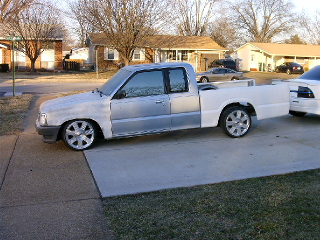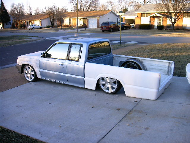 Chrome front bumper and grille, clear corner and bumper lights, shaved door handles, cadillac tail lights, mirror window tint, power removable sunroof, APC H4 conversion headlights. B2600 hood and shaved fenders and cowl wheel tubs in the bed and under the hood