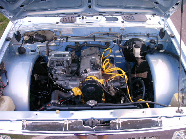 Engine bored .020, new crank , pistons etc. Everything in the motor has either been replaced or machined. So far I have around $1500.00 in the new motor. 32/34 Weber carb, 8mm accell plug wires, NGK spark plugs, accell super coil, pacesetter header, flowmaster muffler, no emissions crap. Motor painted mazda 6 yellow and engine compartment painted alfa romero blue that flips to gold.