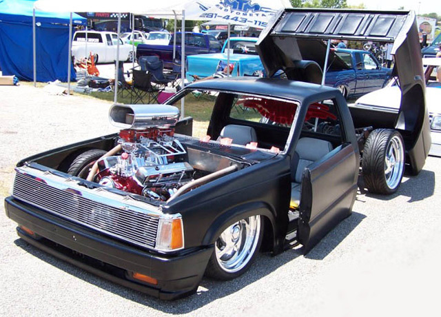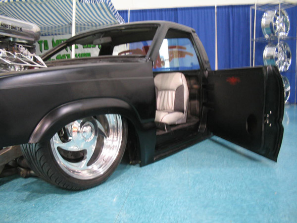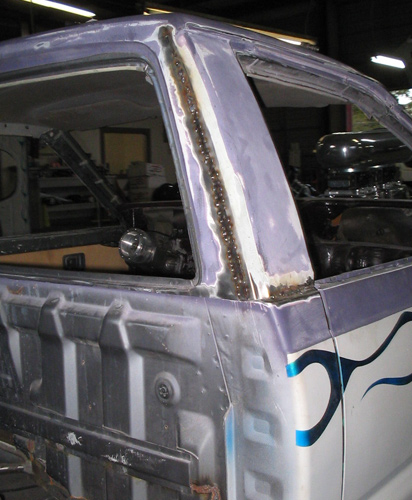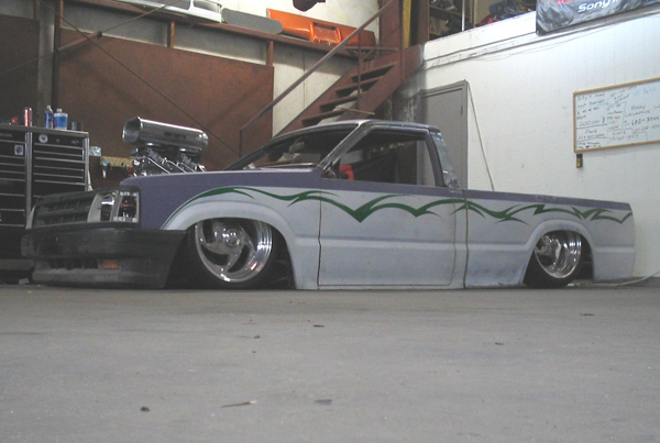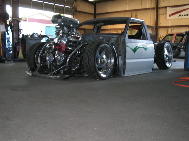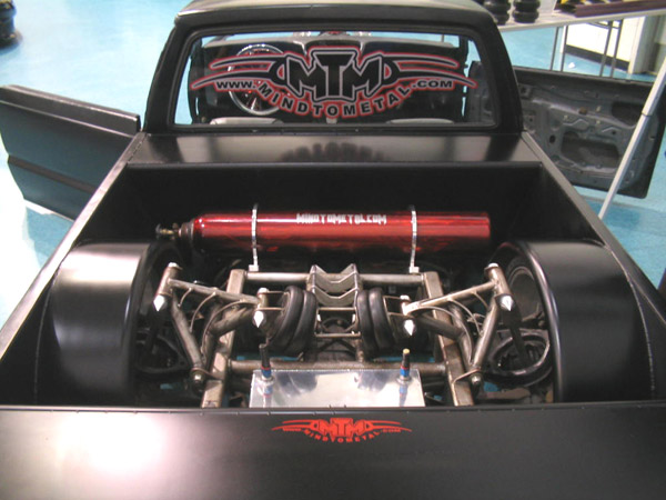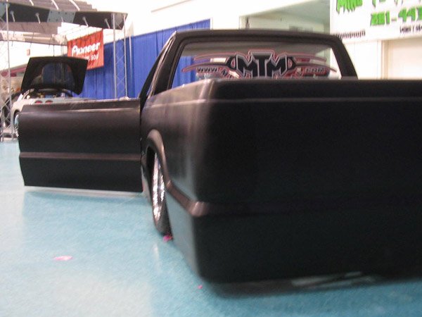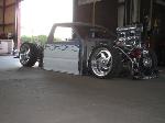 Fully shaved. Body dropped 4 1/2", 2 1/4" Chop Top with stock back glass.. Truck is now 45" tall. Suicide doors. Molded side window frames. sheet metal bed. flat black for now..
