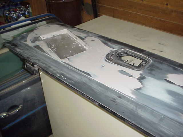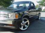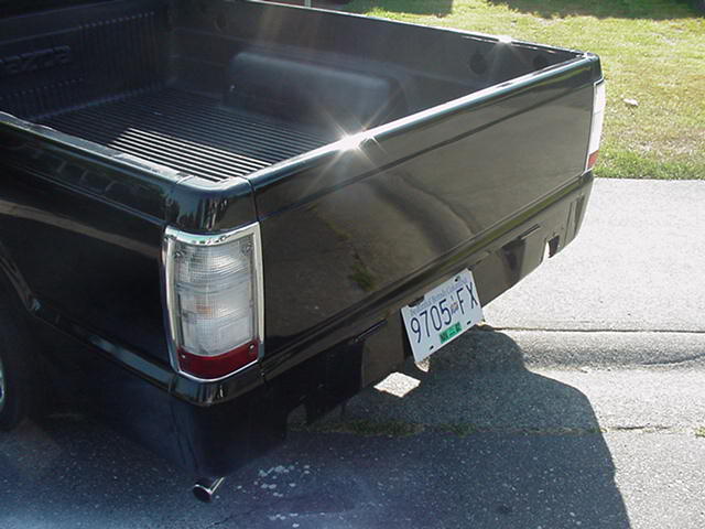 black soon to be primer, frenched plate shaved tail gate handle shaved plastic vent things behind windows. chrome grill and bumper clear tail lights