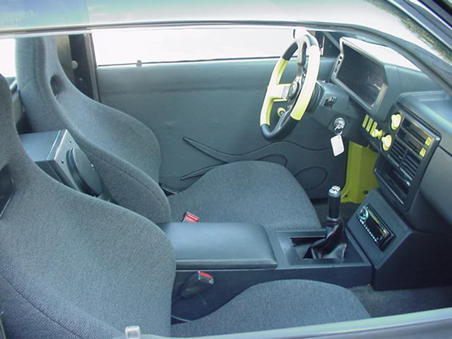 charcoal vinyl with yellow and carbonfiber highlights custom center console . tweed nissan 240sx bucket seats.new carbon fiber AUTOMATIC (haha) shifter knob custom flamed door panels