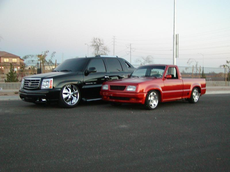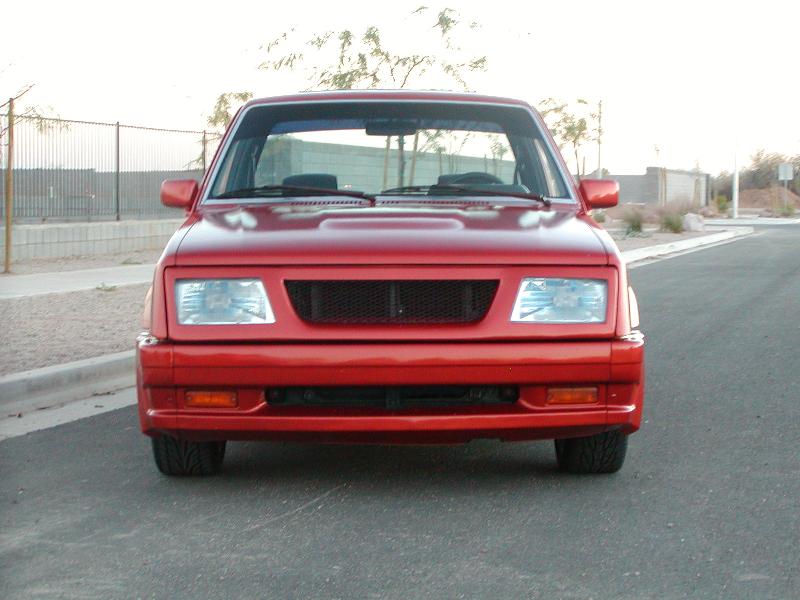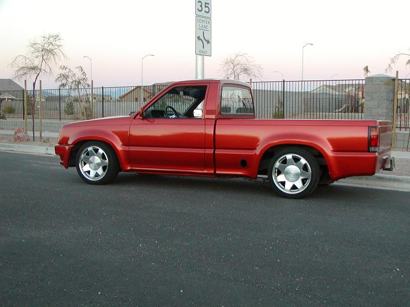 Dodge Neon Burnt Orange with Prowler pearls added. Shaved handles, corner lights, rollpan, tailgate welded shut, Sunroof, 1/8" Steel bedcover, 4x4 fenders and bed. Paint will stay like this till truck is done and then get full color change with graphics. Audi headlights with a custom grill. Chrome license plate bracket.