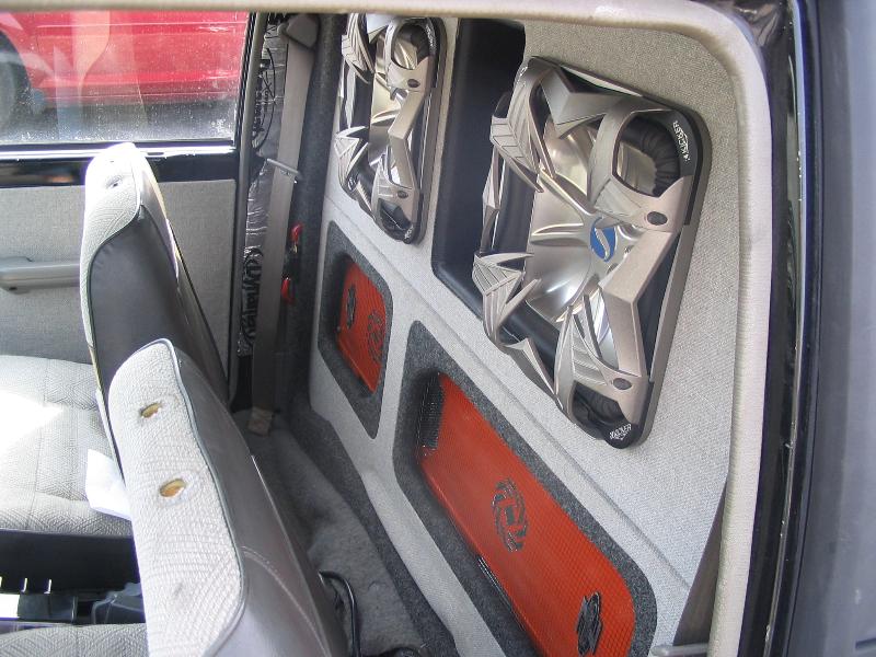 custom door panels with 2 sets of focal 6.5" compnents fiberglassed in the door and wrapped in tweed, full wall with two kicker L7 12" subs, cadenec z4000 amp for the highs and z7000 for the subs, 5 farad capacitor, deka deep cycle marine battery for stereo with battery isolator and red top battery for truck, radio relocated into heater control panel, 6.8" ion tv molded into factory radio housing and wrapped in tweed, also hooke up to rear view camera in license plate
