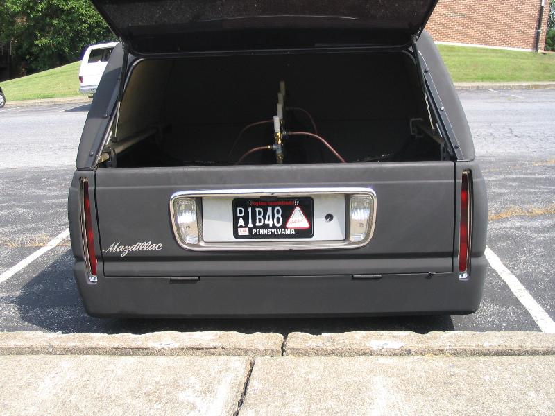 flat black primer, 17" escalade wheels, cadillac taillights, 2003 cadillac license plate holder and reverse light set up, 1968 cadillac rear side markers toyota chrome front bumper and lower valance, shaved handles, tailgate, and wiper cowl