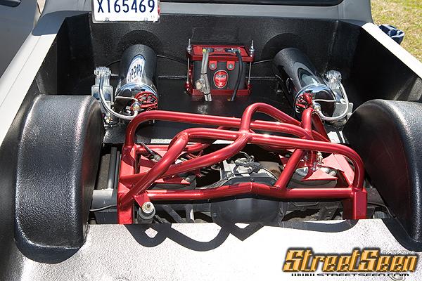Bagged w/ Parallel 4 link, Firestone 2500s, (2)chrome 3 gallon air tanks on (2)Viair 380s, ODE 3/8" Valves, 3/8 lines, custom tubing on notch painted deep red pearl, 3.5" Traditional Body Drop