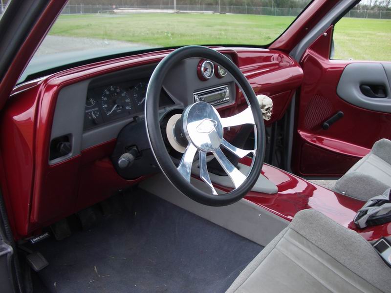 Smoothed and Painted in a deep red pearl, Center Console w/ Subs, Racing Style Seats that are uncomfortable as hell, B.A.D. billet steering wheel to match the Bonspeeds