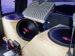 clarion tv head unit, dvd/cd/mp3 player, kenwood componet system, MTX crossover, 2 1 far. caps, Kenwood ps400m mono amp, 4 15" Fosgate subs.