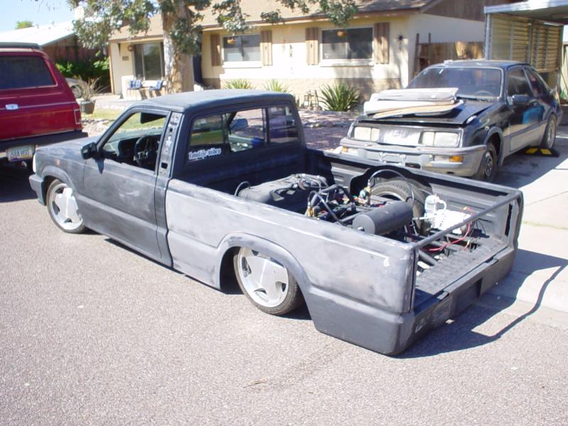 Shaved door handles, no tailgate at the moment, molded roll pan, led's in place of the stock tail lights, crappy flat black paint or whats left of it.