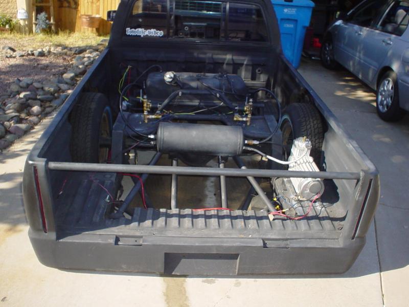 Dual triangulated reverse 4 link, 2600 firestone bags, 3 or 5 gallon tank, viair 550 compressor. 1/2 inch fill valves and 3/8th dumps. Front is going to be bagged as soon as I have time. I plan to have 2600's on the front too.