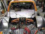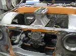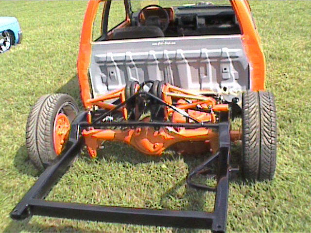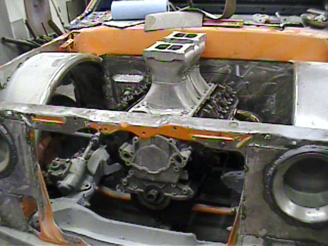 Ford 302 with C4 tranny, chromed and painted. Turbo ram with dual carbs.