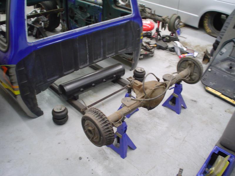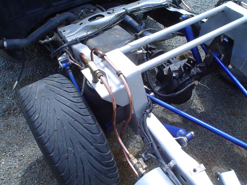 Lowered I-Beams, Relocated radius arms, raised tranny x-member, Slams all the way around, Reverse Triangulated 4 Link in rear, with a monster notch and 3/8 port bags. 1/2 Brislands valves, custom made tanks, copper hardlined, with a scubba tank and a sanden belt driven compressor, on a homebuilt mount. got the new frame got tubular a-arms, slam RE-7 all the way around, Forward facing 4 link from Suicide. All work going to be done by me, at my shop. :)