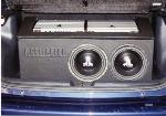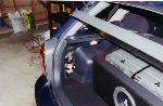JL Audio 300/2 amp in front doors. Audiobahn triaxials in rear doors. Subs and amps mounted in custom box in trunk. Head unit in custom carbon fiber faceplate with Dakota Digital volt meter in brushed aluminum and teal readout. Disc changer mounted in glovebox. Stereo install by Mooner/Adam of West Point Customs. Hit 137.5 db first time out.