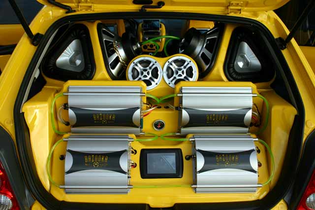 FULL bazooka sponsored set up with 4 triangle subs, 14 vocal speakers, 4 amps and liquid cooled subs and amps. 4 TV's, DVD player and Sony Playstation.