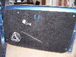 Geo metro buckets, billet window cranks, black door panels with ostrich, blue tweed dash, black carpet, killed and skinned cookie monster for my headliner