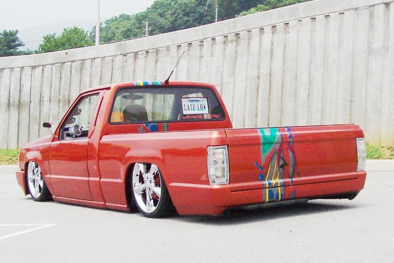 Shaved all handles,locks,antenna,all body seams, eclipse bubble in hood,vw/fuba antenna mounted where cargo light used to be,smooth roll pan, custom bumper, '99 Isuzu copper orange metallic w/ 14 color graphics & bodydropped 2 1/2"