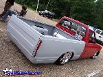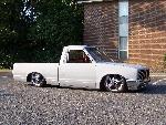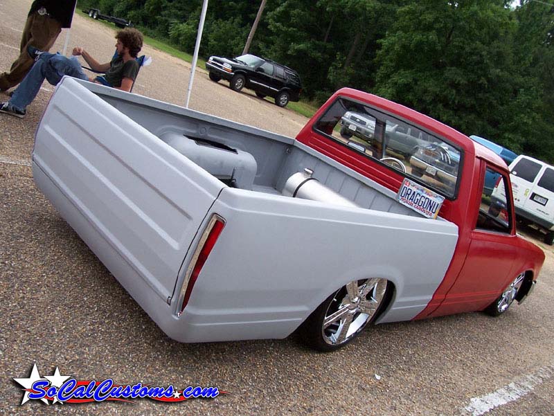 Grey primer, SHAVED antenna...corners...gas door...hood squiters...door handles...tail gate handle, grant kustoms rollpan, caddy tail lights frenched in upside down, phantom billet grill, diamond back conversion headlights, 2wd toyota bumper