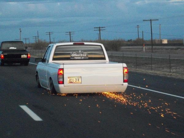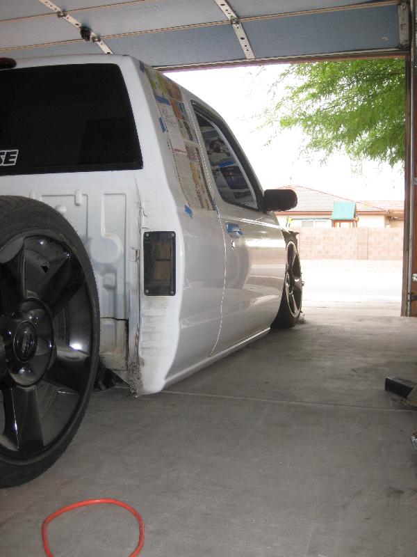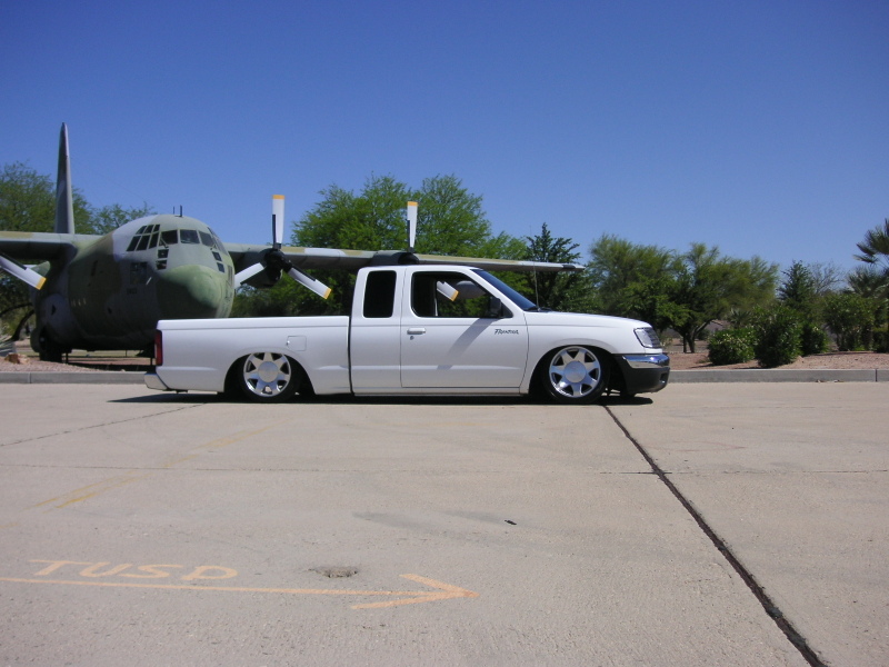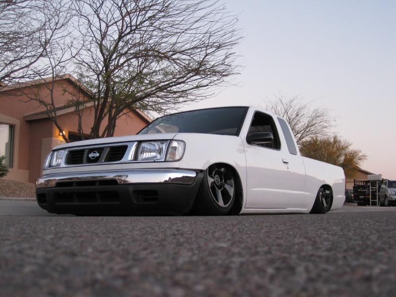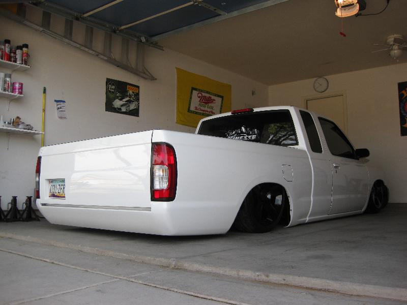 4" Body drop (2.5" stock floor, 1.5" traditional), tubbed for a 27" tire, Clear corners, 6k HIDs, 98-99 Frontier tails(clear reverse light), phantom grill, tint, solid rear window, checkermate tonneau cover, relocated handle, platebox in tailgate, smooth roll pan, shaved cowl, street scene mirrors