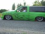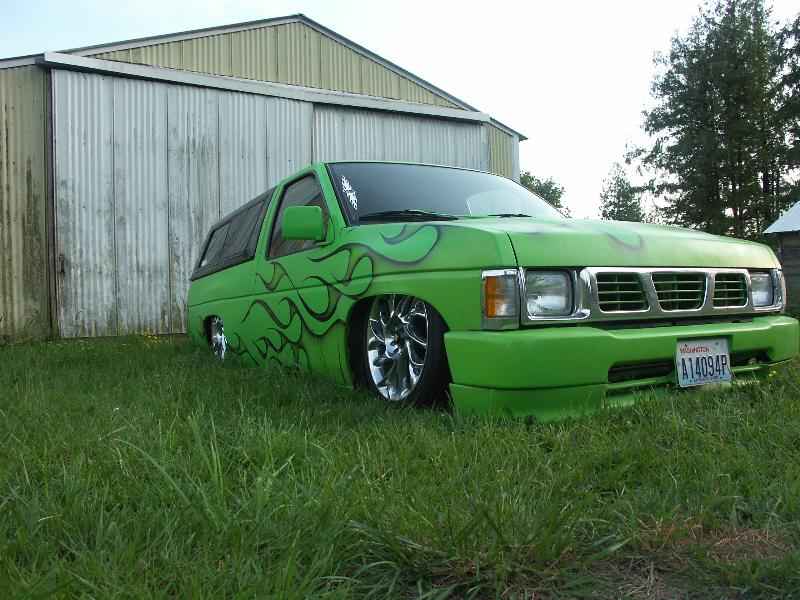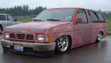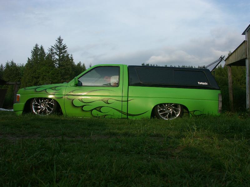 3"Body drop, shaved gas door, emblem, antenna, hood squirters,cowl, door handles and 3rd brake light, frenched plate box in tailgate skin, roll pan, 92 Toyota bumper w/plate box & shaved signals W/96 Tacoma valance, Clear Tail lights, Leer shell W/Blazer windows.