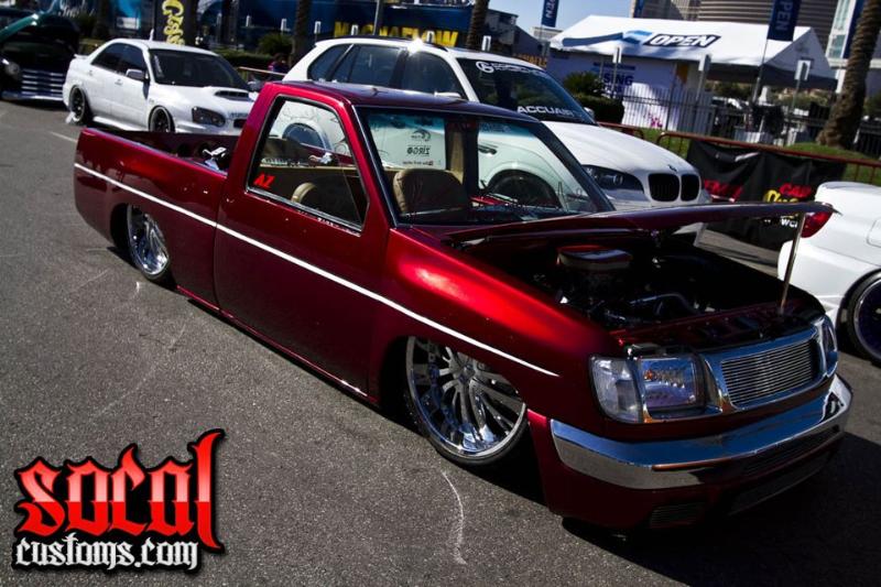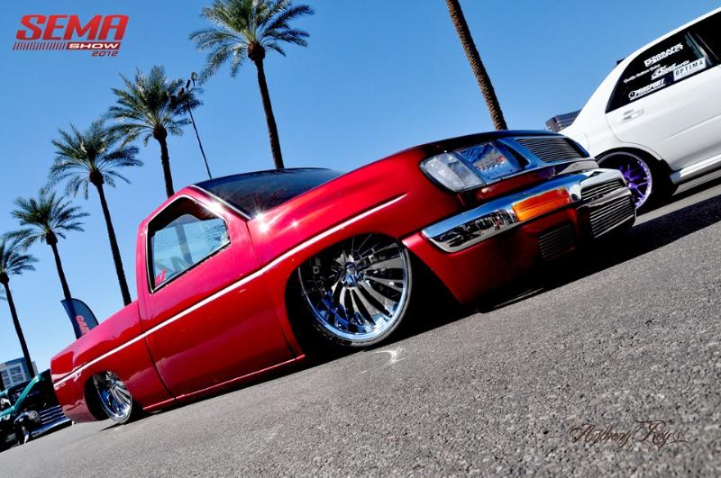 Painted Rasberry Red w/ silver leaf stripe, shaved handles, side mirrors, tailgate, gas door. Frontier front end, shaved hardbody cowl made to fit w/ frontier hood. Billet grilles, flush mount tail lights. Performed by Mike Salerno @ Salerno Custom Paint and Chapy Andrews @ Sinister Fab Werks SLC, Utah.