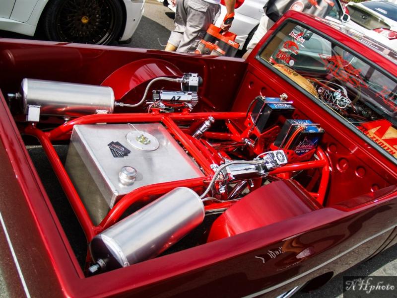 Full powdercoated tube frame (2x3 under cab) Slam Specialties RE-6s in front, RE-7s in back. 2 Air Zenith chrome OB2 compressors, all steel braided lines, chrome 4 link, chrome A arms,powdercoated spindles, slotted & drilled rotors. All work done by Mike Salerno @Salerno Custom Paint SLC, Utah