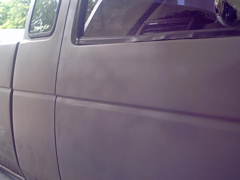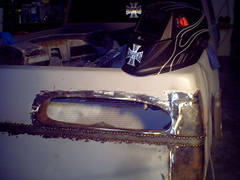 primer and body dropped 3 inches, king cab/long bed, full skin combo, smooth inner bed sides, full phantom grille, sliding ragtop, shaved hood squirters, cowl panel, antenna, emblems, door handles, body line, taillights, supra tails and mirrors, harley mirrors, custom 1x1 sq.tube front clip, 4x4 fenders w/ custom mounting rails, goin suicide style as we speak