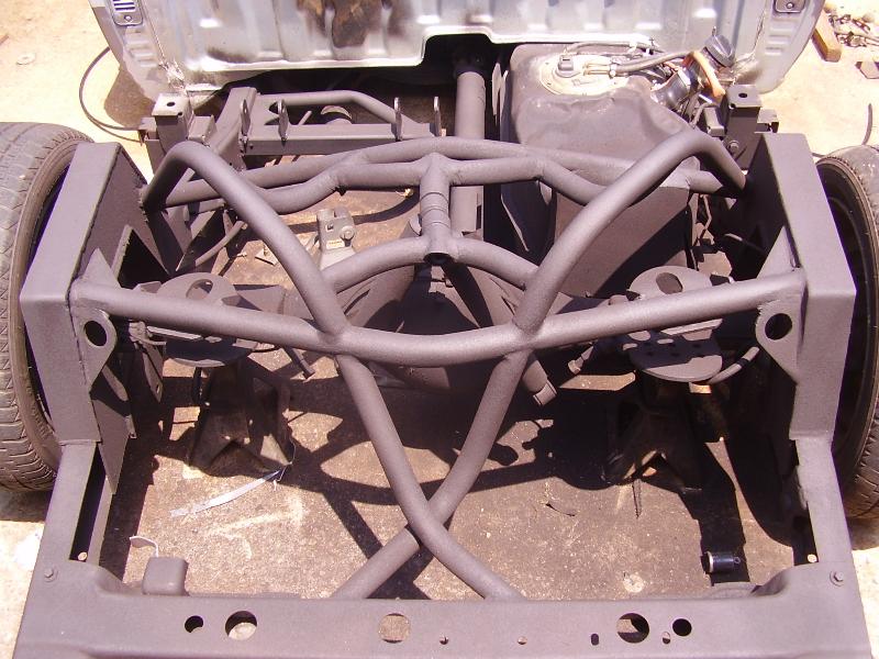 custmon wishbone, over 20ft of bent 1inch dom tubbing, crazy shocks and behind the axle slams. the back was sprayed with undercoatend and then black over it