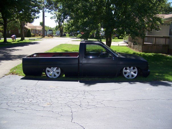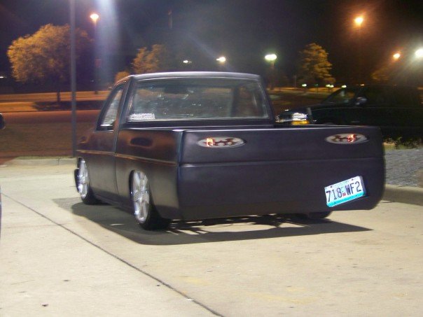 freshly sprayed black primer,shaved doors, wiper cowl, clear corners, fenders been cut down for shaved toyota front bumper with a crooked plate and billet piece, gas tank door, full skin with flamed tail lights, crooked plate, new chrome mirors