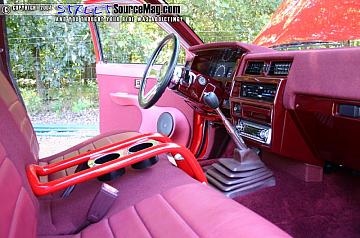 Billet Specialties Chicayne steering wheel, door panel/speaker pods, tubular console, Burgondy tweed and leather, chrome handles, window cranks, shifter, Neon Driveway Werks logo