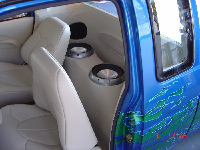 Panasonic TV/DVD player. Rockford Fosgate mids and highs. 2 Fosgate Power 10's in a fiberglass box. Fosgate power 1000 amp