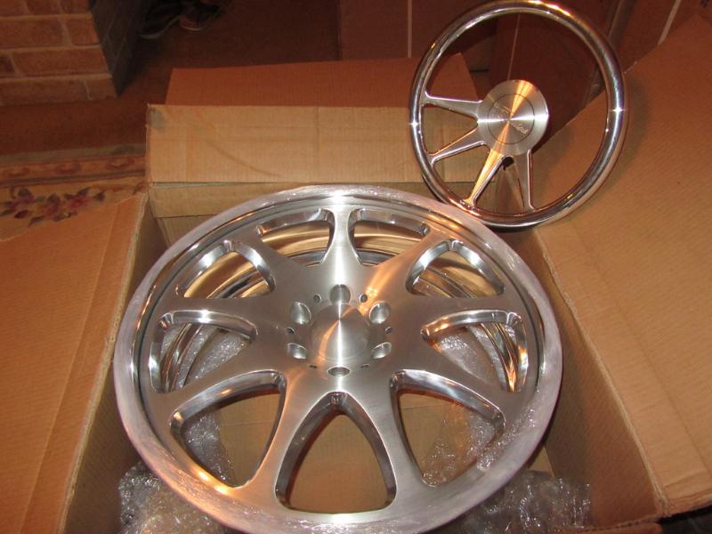 22x8.5 no lip. lol. matching brushed/ polished steering wheel
