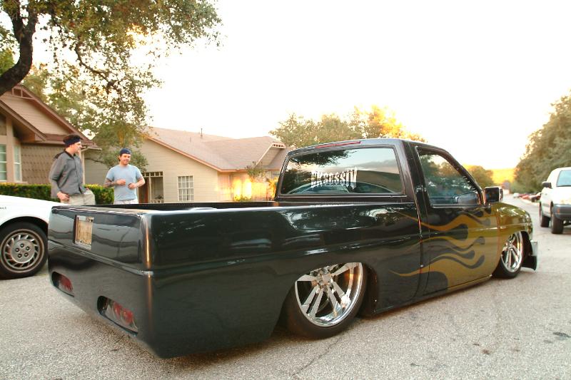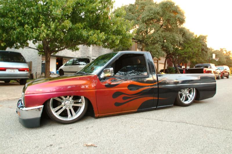 fully shaved with supra tails in the rear and an led third brake light in the cab. Painted nissan charcoal grey with dupont pure fire flames