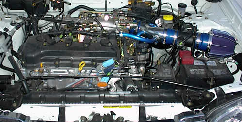 1.8L DOHC, Weapon-R Dragon Intake, BOTH SMASHED UP PRETTY GOOD NOW, and an OBX Racing Tanabe-style free flow muffler which was dragged off by the tow truck driver