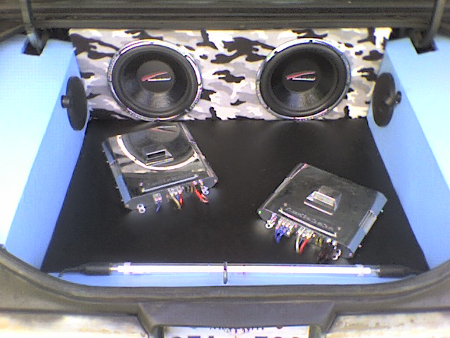 2 Stinger Batteries... Pioneer CD Player... 4 Audiobahn 6 1/2s... 4 Audiobahn 6x9s... Audiobahn 400 Watt Amp On The 6x9s... 6 Audiobahn 12s, 2 In The Trunk And 4 In The Back Seat... Audiobahn 800 Watt Amp On The 2 12s In The Trunk... Bazooka 2000 Watt Amp On The 4 12s In The Back Seat...