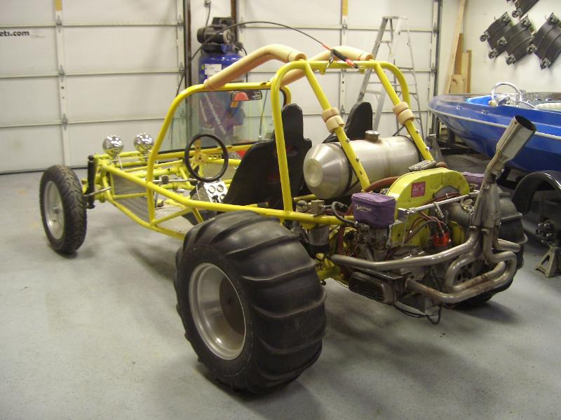 1641cc VW motor, swing axle transmission, Bugpack shifter, bugpack pcv breather, dual weber idf 40 carbs, electric fuel pump, remote oil filter and cooler, high output coil, hydraulic clutch