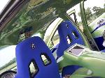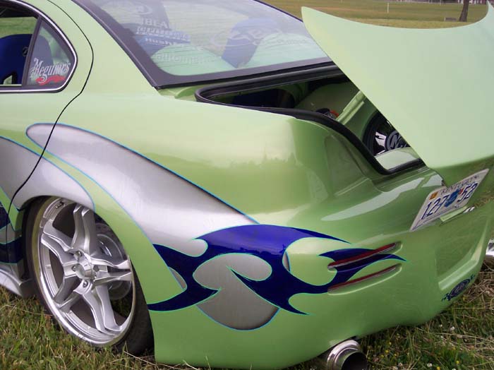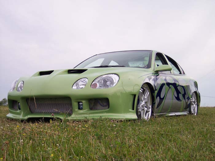 An eight toned paint job done by GB Customs. A full tilt front end (hood w/ ram air scoops, top half of fenders, and custom made front cover fiber glassed together) that contains Lexus GS 300 headlights. Also, hand made original side skirts and rear cover, shaved body lines, door handles, third brake light and antenna, color matched calipers, fog lights, shaved taillights, flip trunk, tilted and freched in license plate box, mirror swap from Eclipse, Sparco gas door, fiberglassed trunk insert painted, frenched license plate, custom name plate in trunk.