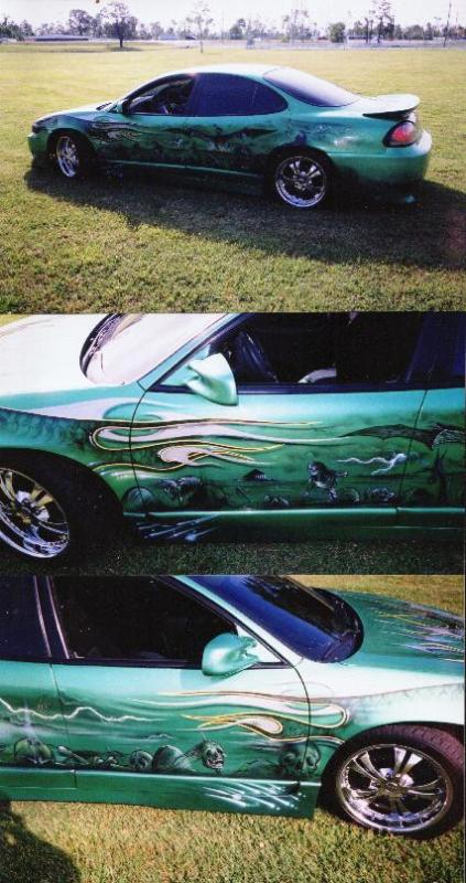 everything shaved ( door handels, gas door, trunk key hole and all moldings) full "aed" body kit, slp wing, cf euro tails, HOK planet green paint, with silver with limegold out line, airbrushed tribal flames(silver) with traditional flames overlappin with dragon skin in the green flames ,full faces brakin threw the paint