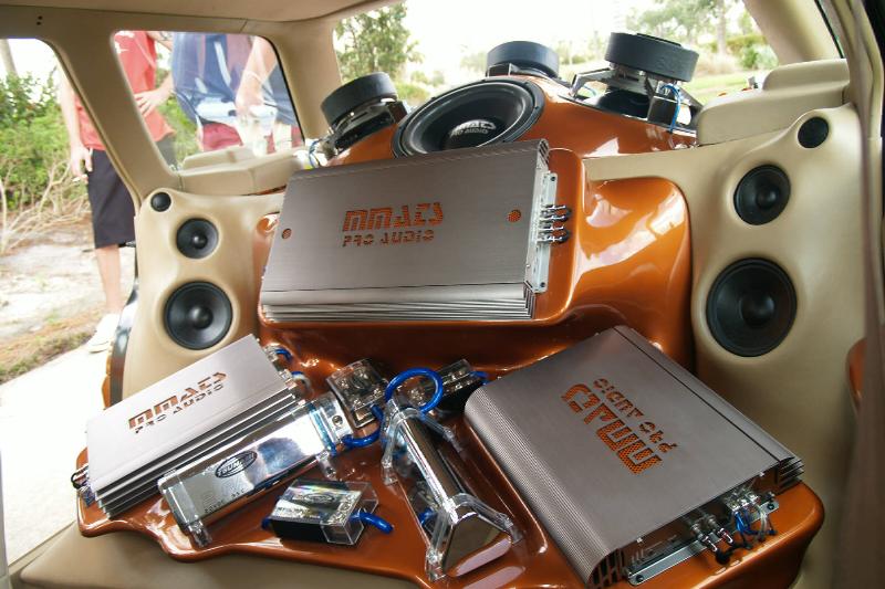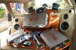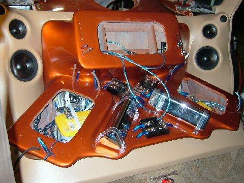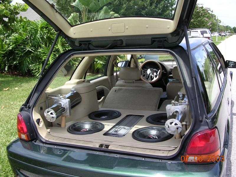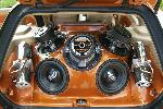 fiberglass sub floor, 4 12 inch kicker comps., alpine mrv1505 on bass, and a alpine mrvf405 on hishs and mids, boston pros, and a alpine head unit