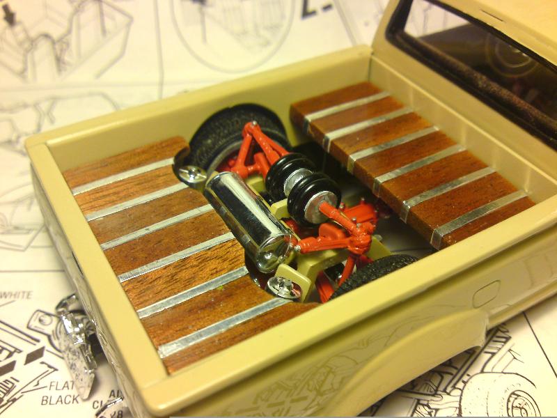Dark brown leather bench seat, carpet, Wood door panels, '48 Chevy dash and stering wheel