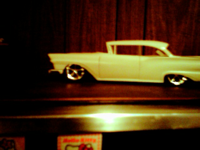 shaved all chrome on the body....choptop frenched head and tailights (custom tails)opening doors...(hood opens stock that way) rollpan..(yes a rollpan on a car) gunna be dark metalflake purple...and maybe some neongreen flames