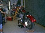 relocated tag to swingarm, chopped and raked front end, Arlen Ness 8" rise drag bars, Arlen Ness flame pegs, H-D forward controls, steel braided cables, Adjure 6" bullet headlight