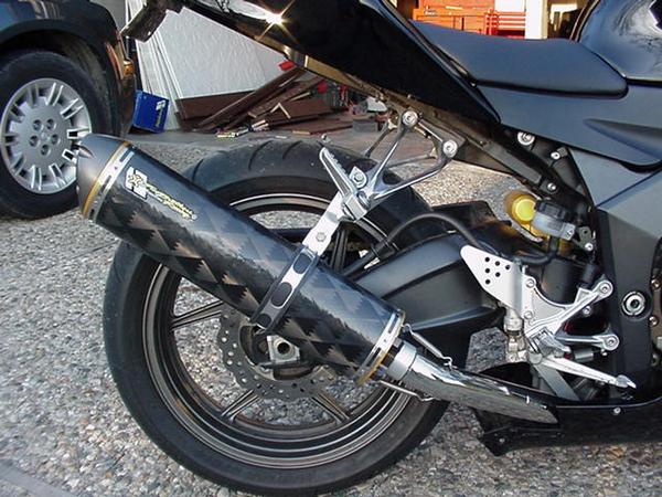 ZX636R, K&N Airfilter, Powercommander with complete custom map, 1 tooth down in front and 2 teeth up in the rear Vortex Sprockets, custom header, and Custom mid pipe from Two Brothers with M2 Carbonfiber exhaust.
