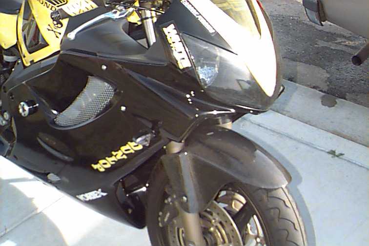 Carbon fiber: chian giard, heel guards, yoke cover, crank case cover and front fender. Yellow tinted speed euro screen. Custom painted black front fairings with mash inlays, and carbon fiber inlay frame sliders. Gp Steering Stabalizer