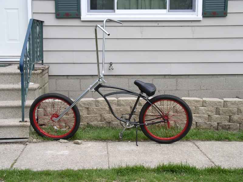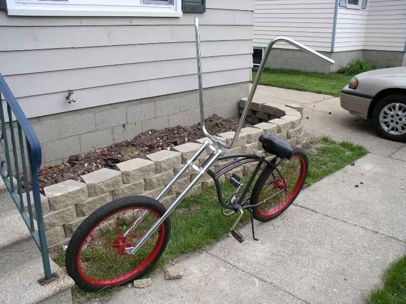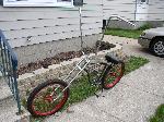 flat black, 45 degree rake, triple tree forks, the biggest fn ape hangers i could find.